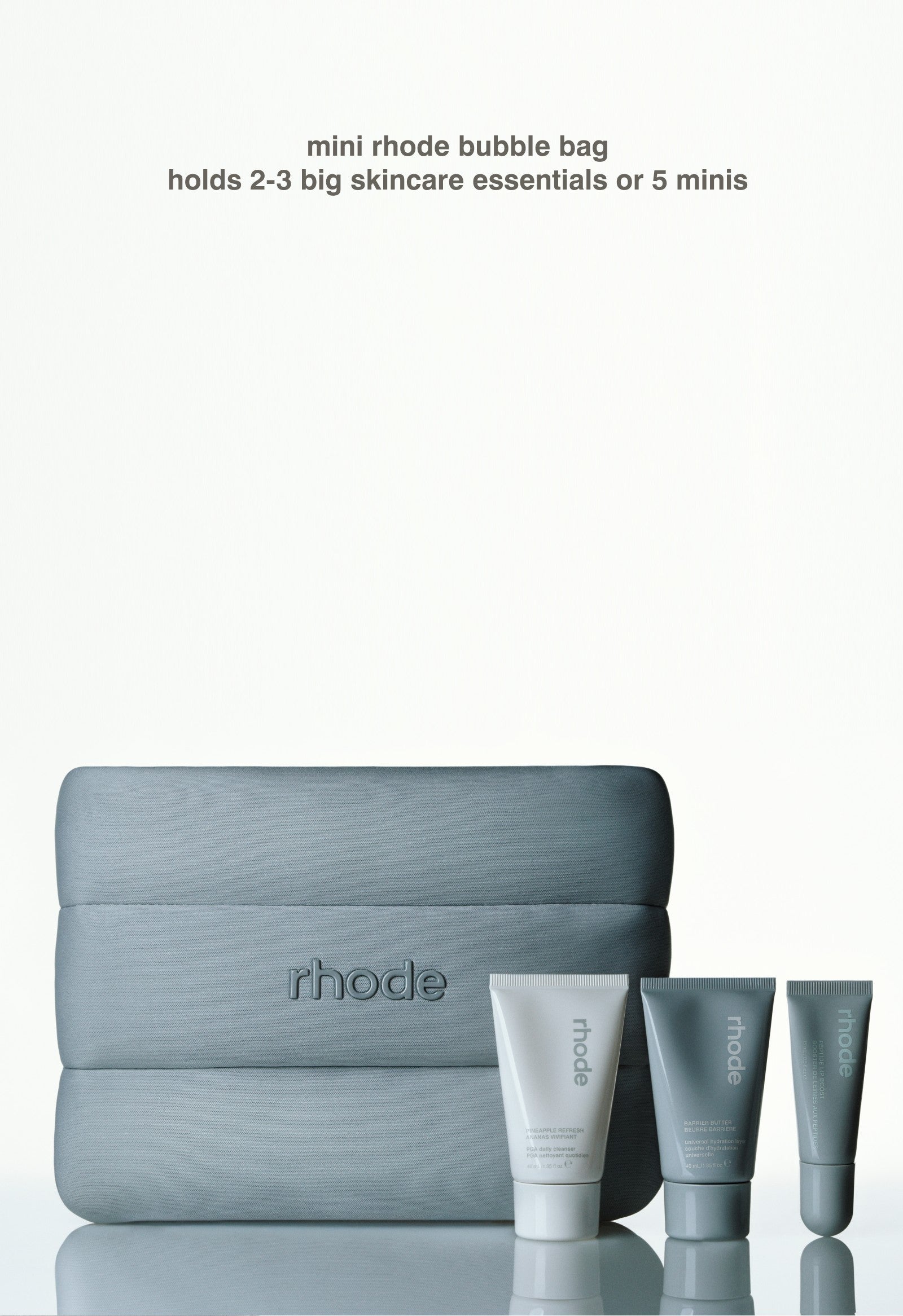 Our signature rhode bubble bag, made mini. Perfect for throwing in your purse and taking on your travels, so your rhode favorites stay in reach. Holds 2-3 big skincare essentials or 5 minis. Size: 9.5″ length / 7.5″ height.